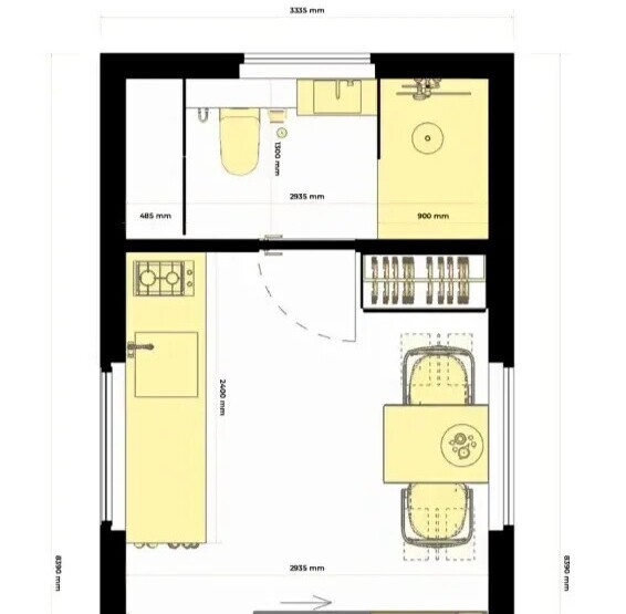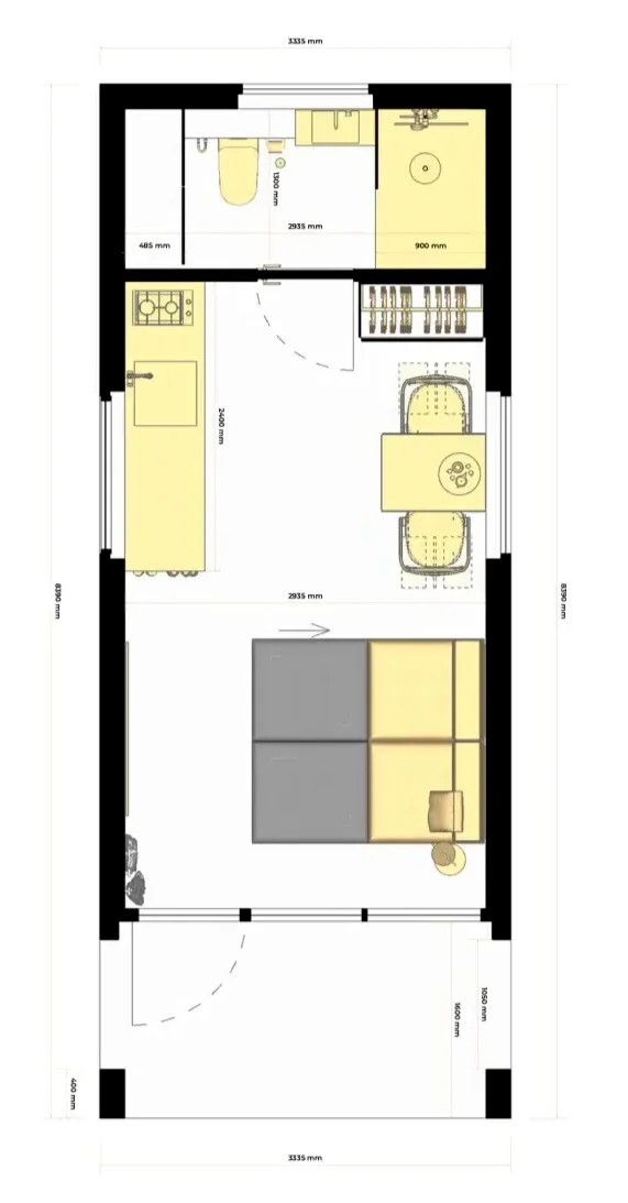 Зонирован на спальня комната (20,54 м²), санузел (4,35 м²) . Общие габариты: 10x3,33 м, высота — удобная для круглогодичного проживания.