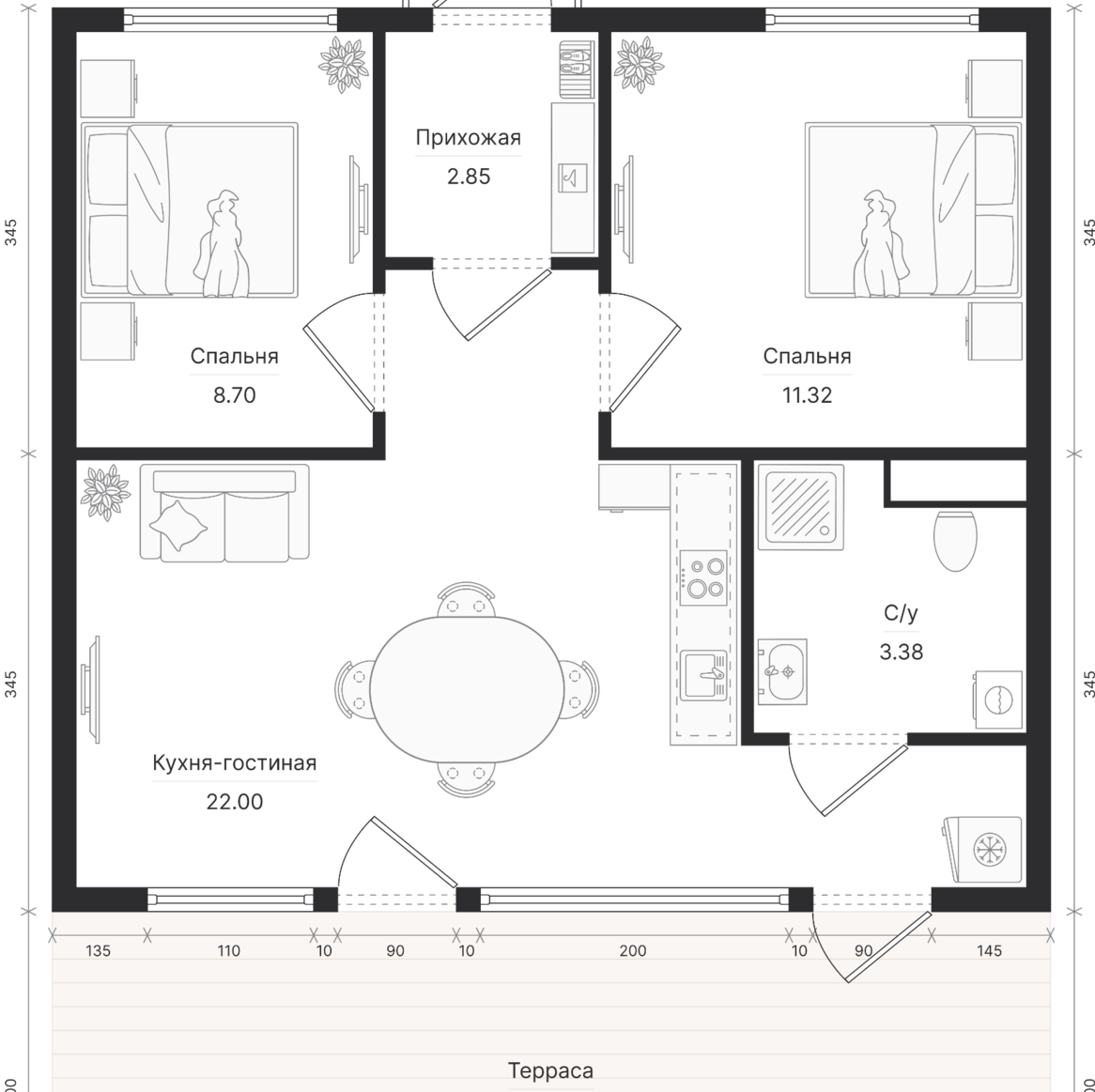 - Функциональность. Эргономичная кухня гостиная, просторных 2 спальни с двуспальной кроватью, компактный санузел с душем и WC.